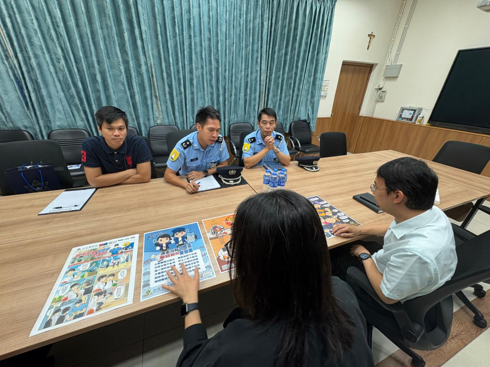 為促進警・校雙方的溝通與合作,澳門新口岸警司處透過「警・校聯絡機制」,在2025年10月21日早上來臨我校與行政代表人員會面,就校園周邊的交通狀況及治安問題,與校方作出深入了解。會議當中,警方代表向我校分享了一些常見的詐騙案例及青少年容易墜入的犯罪陷阱。我校亦就曾遇過的治安問題與警方探討。透過相互交流,雙方都能更好地改善校園交通及治安環境。會面中,我校對治安警察局給予學校的支持及協助,予以肯定。冀望繼續透過機制保持緊密聯繫,資訊互通,共同攜手構建完善的校園安全網絡。